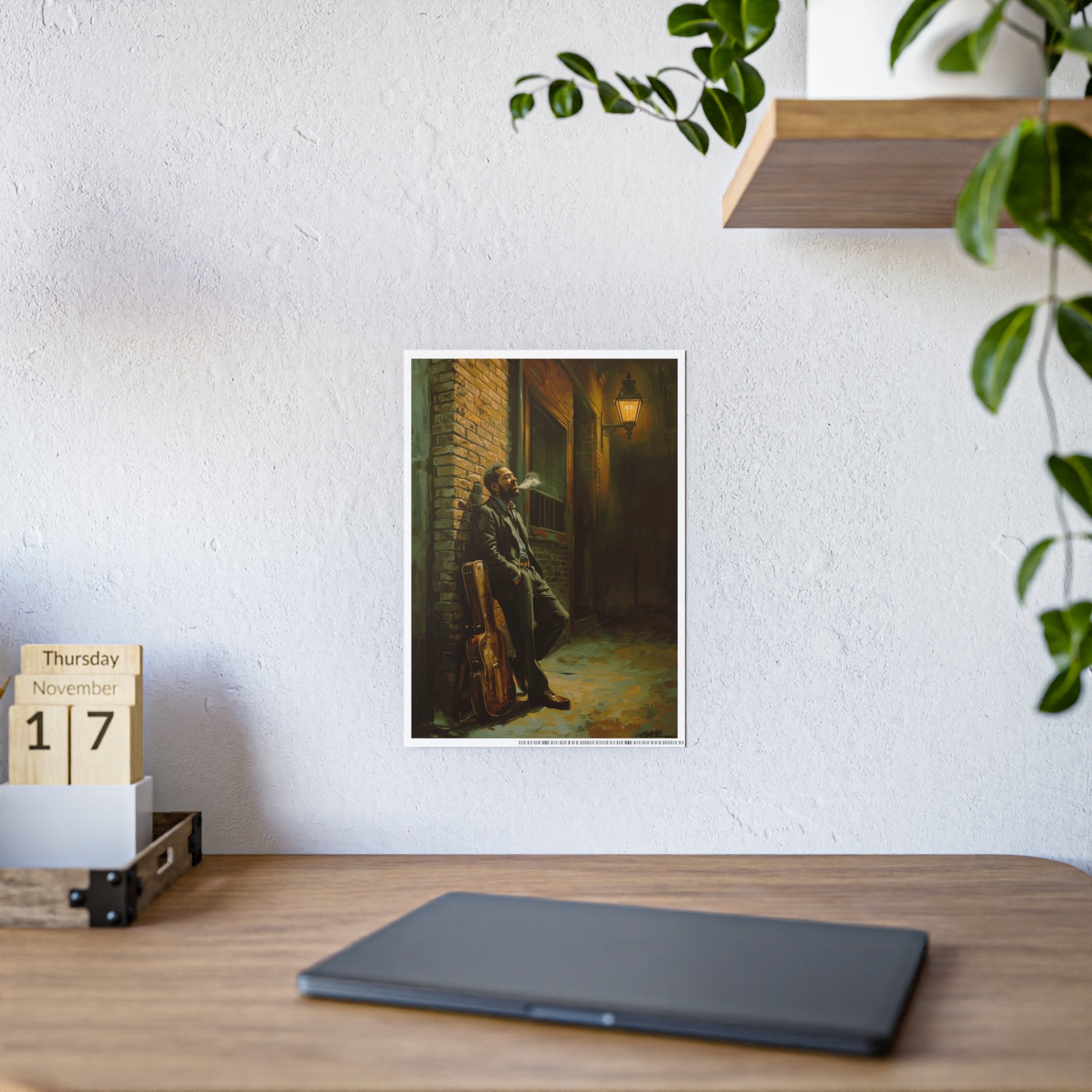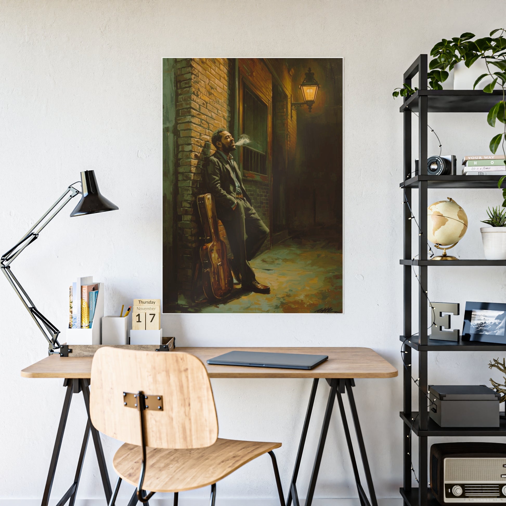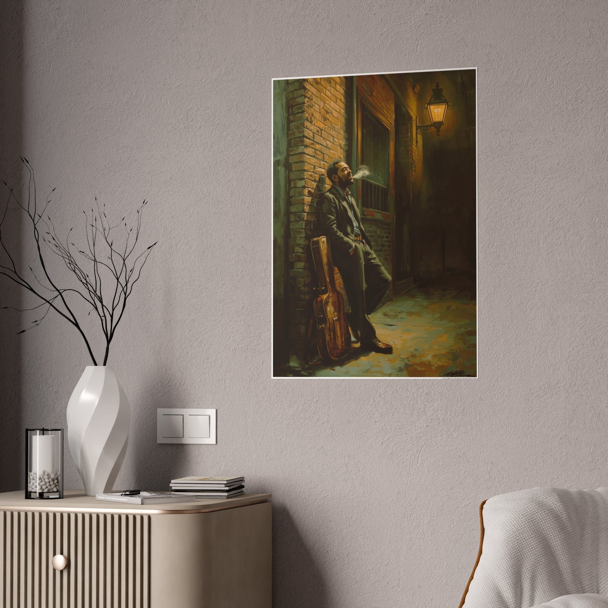 Set the mood with After the Gig, a striking poster that embodies the allure of jazz nights and city streets. Featuring bold contrast, deep hues, and a contemplative musician outside a glowing jazz club, this artwork tells a story of music, solitude, and style. Printed on premium poster stock, it makes a stunning statement piece for your living room, studio, or office. Ideal for jazz fans and lovers of expressive, urban-inspired art.