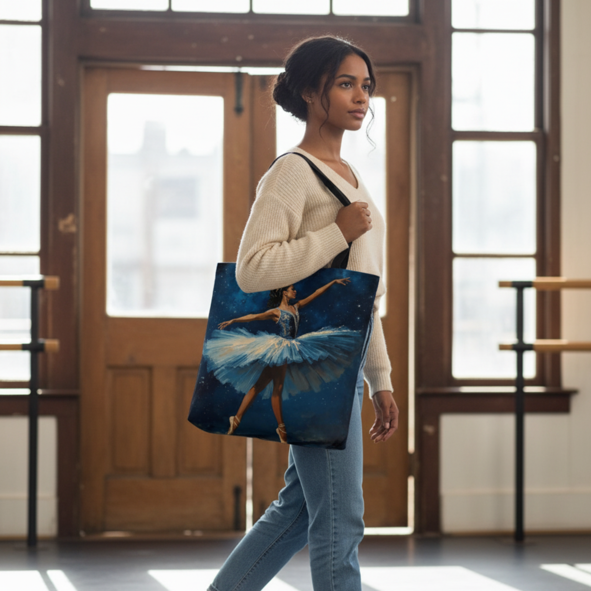 Crafted from durable, high-quality fabric, this spacious tote is perfect for carrying everyday essentials, dance gear, books, or groceries in style. The vivid starry background and luminous blue tutu create a look that’s both sophisticated and inspiring. Whether you’re heading to rehearsal, class, or a weekend outing, this tote adds a touch of art and inspiration to your day.