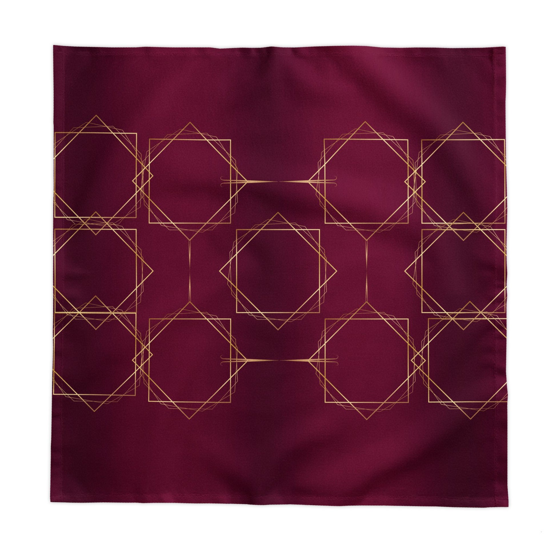 The intricate gold geometric patterns create a captivating contrast against the deep, rich burgundy background, infusing your home with a sense of elegance and warmth. Perfect for adding a touch of sophistication to any room, this piece seamlessly blends contemporary style with classic luxury, making it a versatile addition to both modern and traditional interiors.