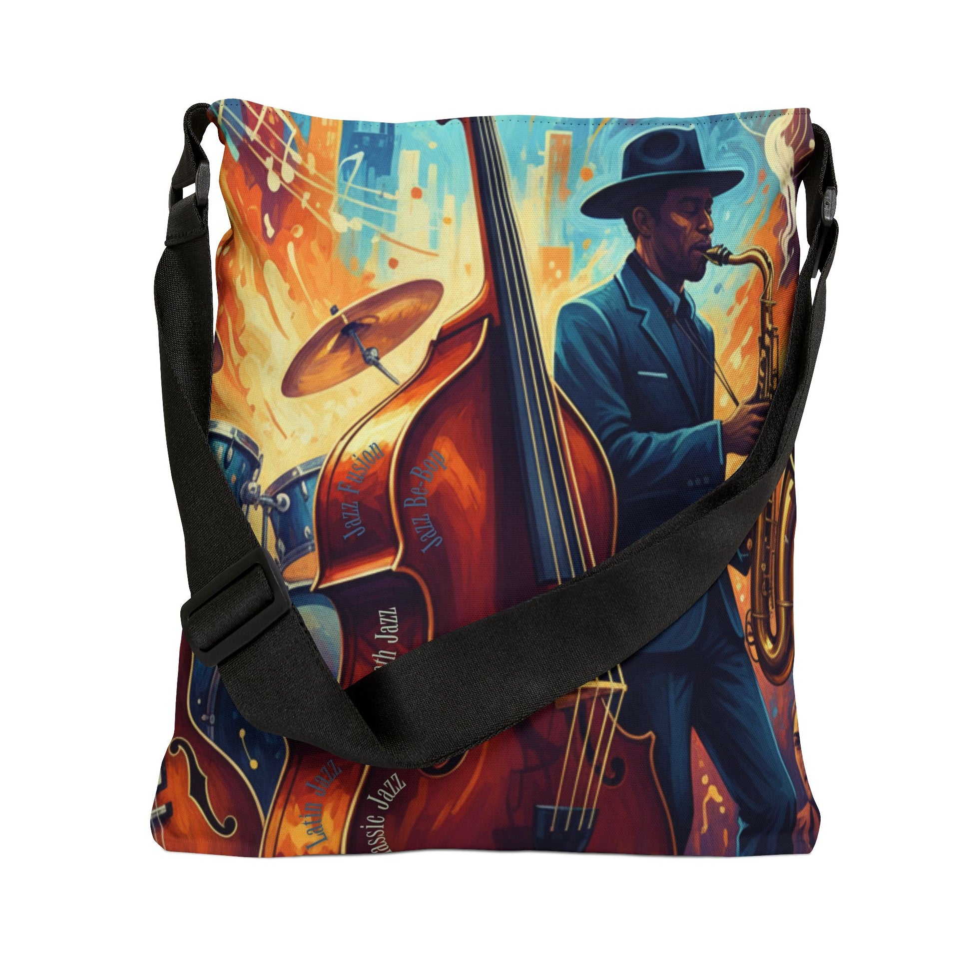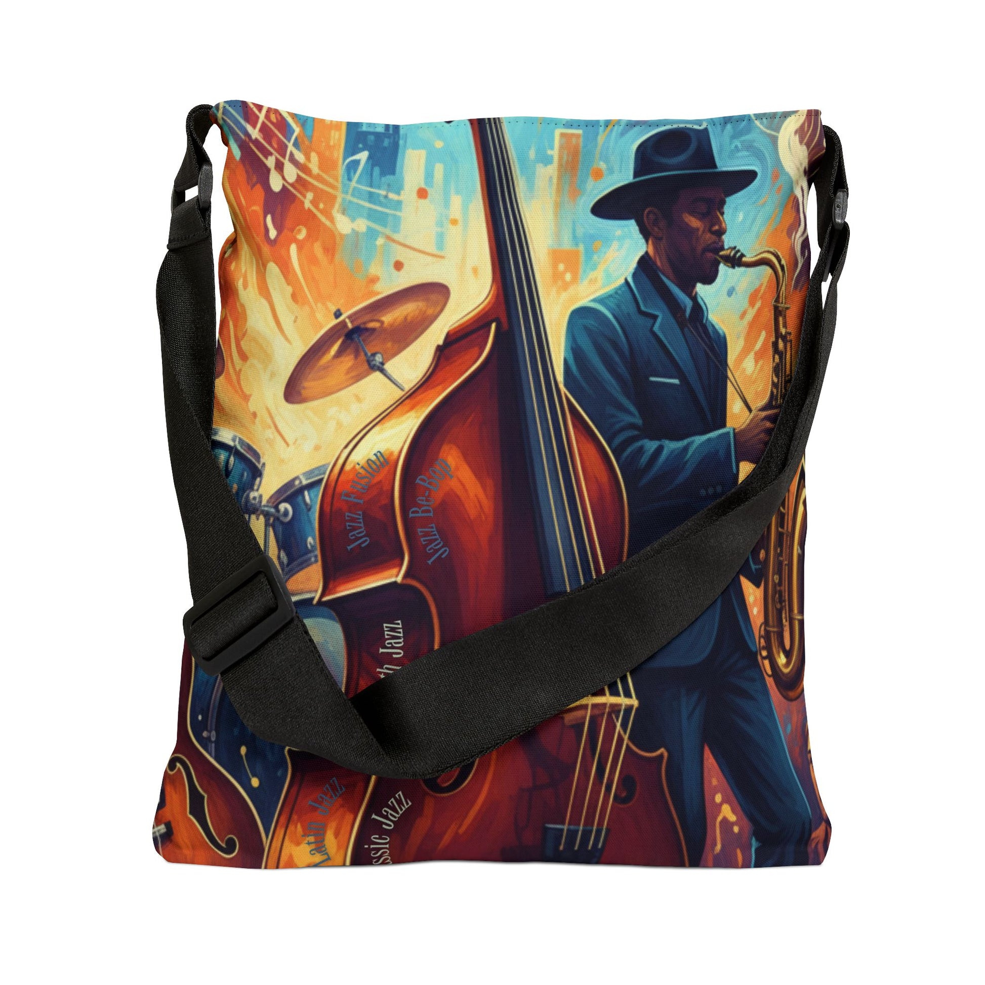 Celebrate the rhythm, passion, and soul of music with the Jazz Music Tote Bag. Featuring a vibrant, artful scene of a jazz saxophonist surrounded by rich tones of blues, oranges, and golds, this tote captures the energy and spirit of a live jazz performance. The design evokes creativity and movement—perfect for music lovers, artists, and anyone inspired by the beat of the city.