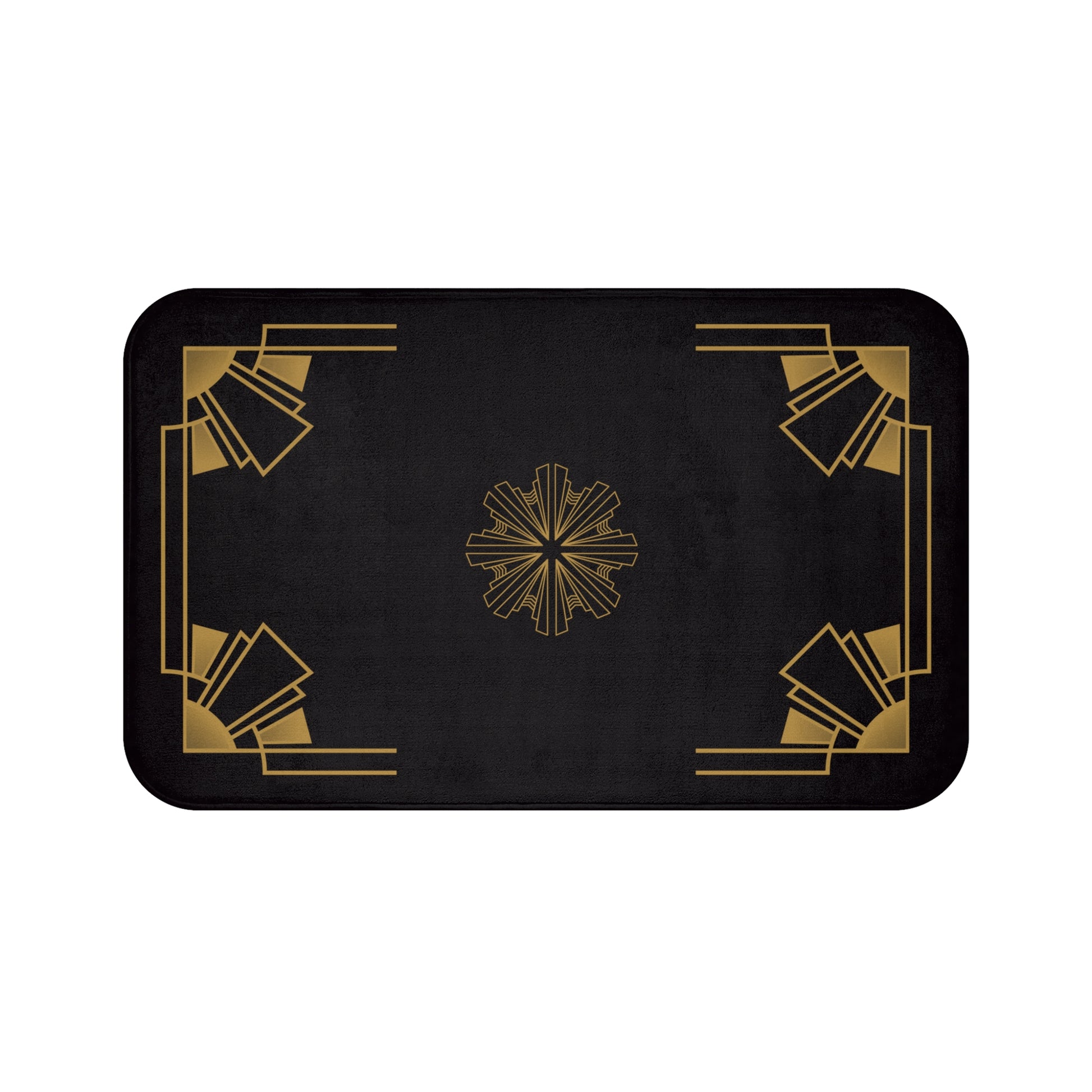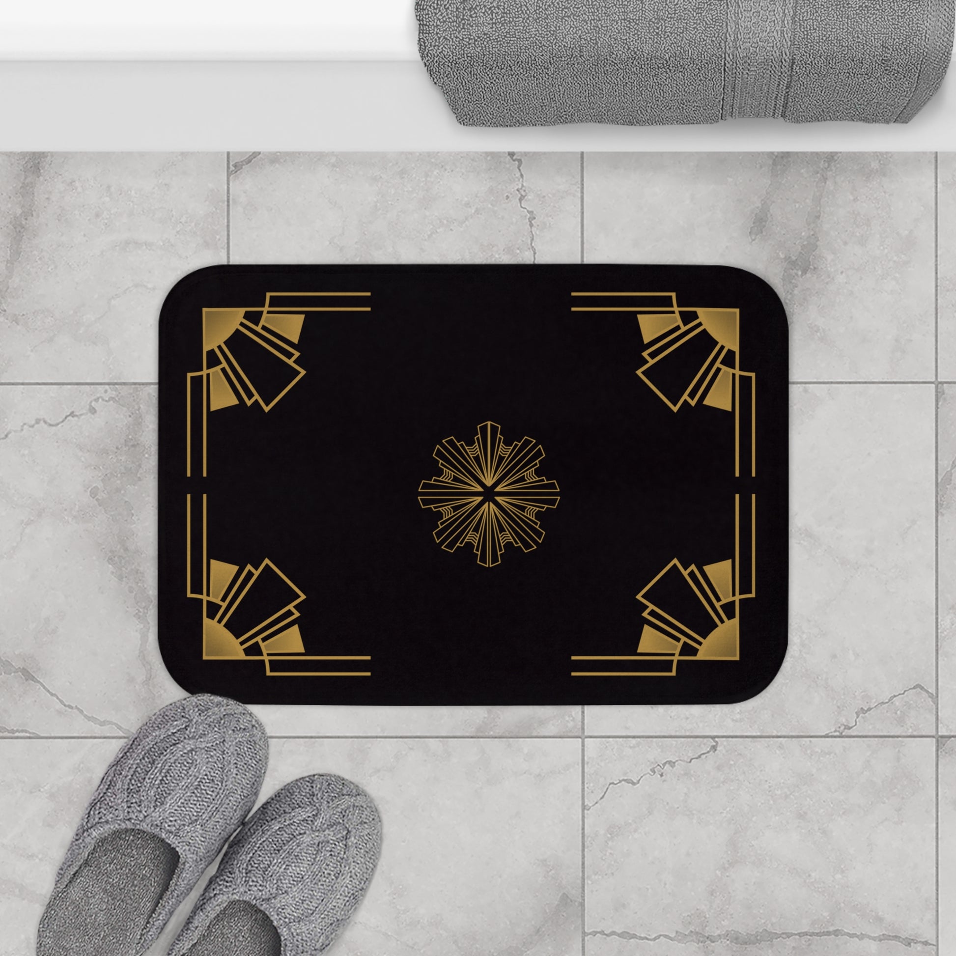 More personalization options for the most private room in one's house. This bath mat is as practical as it is stylish - the anti-slip backing keeps the bath mat firmly in place and reduces the risk of slipping. Add a touch of timeless luxury to your living space with our striking design, Midnight Luxe. The intricate gold detailing contrasts beautifully against the deep black background, creating a sophisticated and glamorous look that embodies the essence of the Art Deco era. Perfect for those who appreciate classic design and want to elevate the ambiance of any room, making a bold statement of style and elegance.