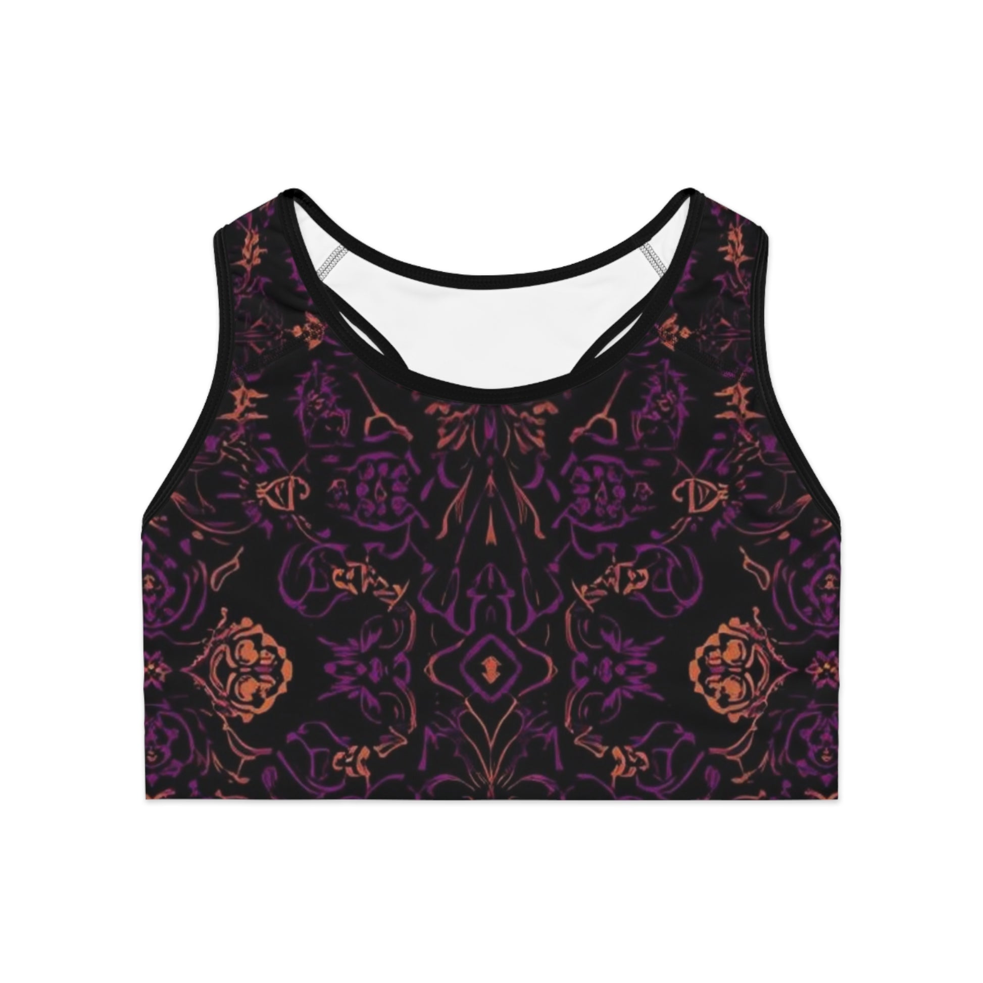 The Orchid Dusk Sports Bra features an intricate, symmetrical pattern layered in deep orchid purple and warm copper tones against a dramatic black backdrop. Designed for women who move with purpose, this bra blends artistic elegance with everyday performance. Whether you’re flowing through Pilates, powering through a workout, or styling it as athleisure, Orchid Dusk brings beauty and strength into perfect balance.