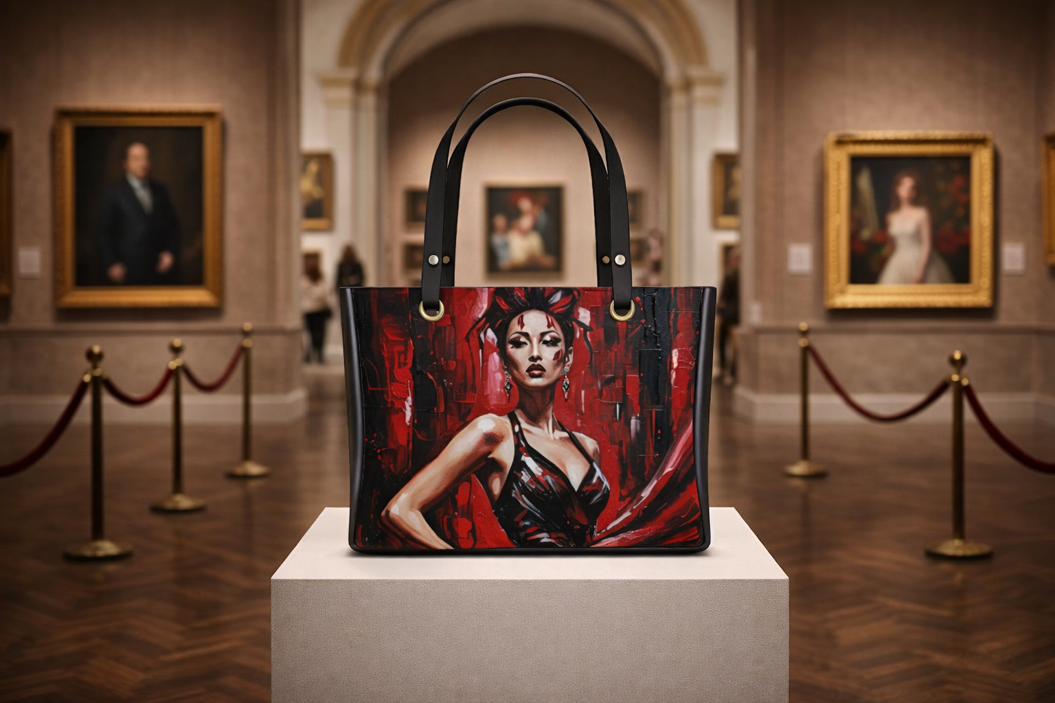 Key Features Striking Visual Design: The front and back panel showcases a vivid, textured art piece in deep crimson and obsidian tones, perfect for adding an edgy glamour to your outfit. Dual-Handle