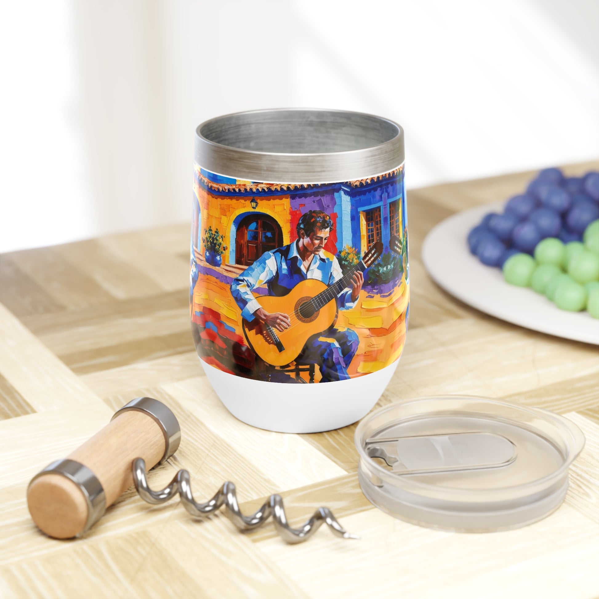 Enjoy your wine experience with our stunning wine chiller, a masterpiece of artistry and functionality. Featuring a vivid image of a man strumming his guitar against the backdrop of a charming Spanish villa, this chiller captures the essence of passion and elegance. Perfect for hosting, gifting, or simply savoring a glass of vino with a touch of romance and sophistication. Celebrate the art of living well!
